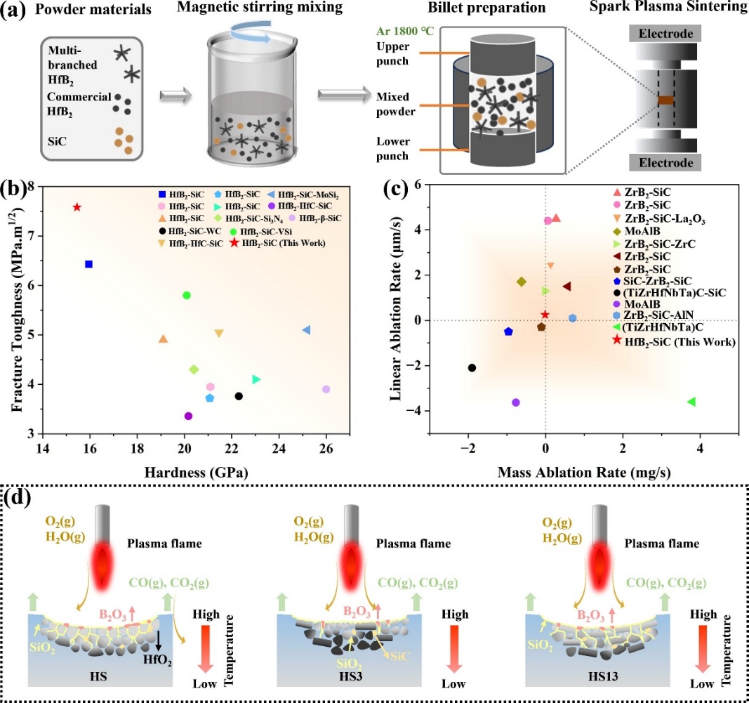 图2. (a)HfB2-SiC复合材料的制备过程;(b、c)HfB2-SiC复合材料与文献中相关材料的力学性能质量烧蚀率和线烧蚀率;(d)HfB2-SiC复合材料的烧蚀机理图。