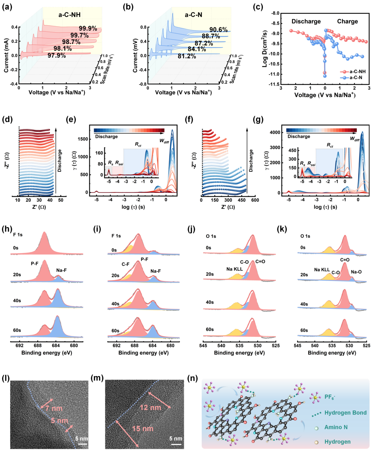 基于此,研究团队通过氨基氮引导孔道构建,利用气相辅助热解方法,在分子层面实现硬碳材料中氮构型的重组及多级孔道的建立。利用NH3在热解过程中的解离特性,使其产生的氨基官能团与碳骨架中的不饱和位点发生选择性反应,将电化学不可逆的吡咯氮转化为高度可逆的吡啶氮构型,诱导形成了垂直排列的贯通孔道结构,进而缓解了“层间限域”效应。同时,引入的氨基官能团能够在电池负极-电解质界面引导形成具有梯度化学组成的超薄SEI膜,而且氟化物富集在其亚表面,可显著提升界面离子的传输效率,大幅减少了钠的不可逆损耗。得益于多级孔道结构与界面协同效应,所制备的硬碳负极的综合性能在斜坡型硬碳材料中表现突出:首次库伦效率高达94.9%,可逆容量达到400.3 mAh g-1,在50 A g-1的极端电流密度下仍保持208.2 mAh g-1的优异容量,并展现出长达9000次循环的卓越稳定性。