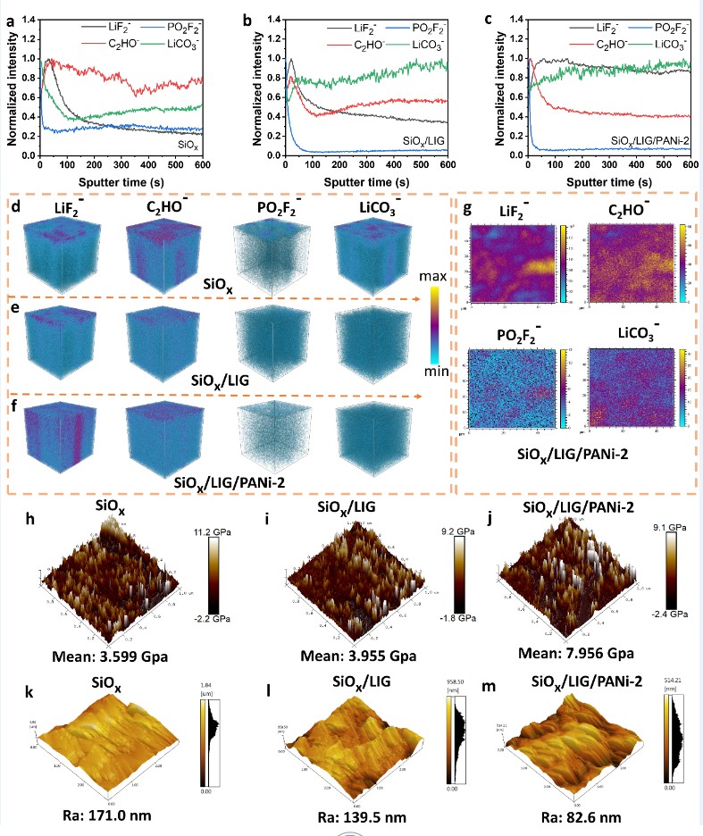 为进一步解决传统SEI层机械稳定性与离子传输效率问题,团队通过多维度探索,提出了一种采用聚苯胺(PANi)和激光诱导石墨烯(LIG)分级双涂层协同调控策略(Compos. Part B-Eng., 2026, 310, 113156)。该策略实现了从原子尺度到宏观尺度的全方位优化:PANi层利用偶极-偶极相互作用,诱导氟化碳酸乙烯酯(FEC)在内亥姆霍兹平面富集并优先还原,形成富含LiF的高致密、高稳定性SEI层;而LIG三维多孔导电框架则有效分散了体积膨胀产生的应力。理论与实验均证实,分级双涂层不仅大幅提升了FEC的吸附密度与结合能,还有效保障了电极界面在反复膨胀收缩下的结构完整性。优化后的负极材料在2.0 A/g下循环1000次后容量保持率达到87.7%,且表现出优异的机械韧性。