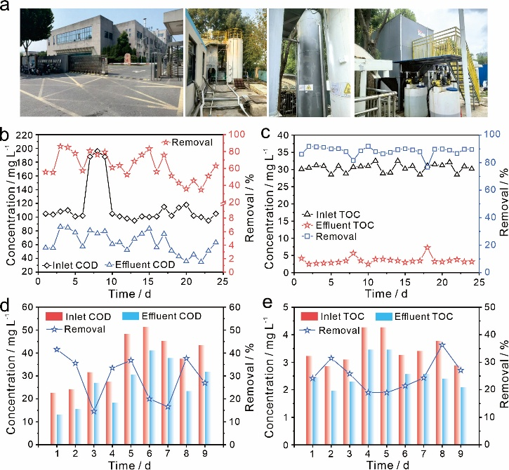 基于上述创新成果,研究团队进一步开发出膜生物反应器(MBR)+催化膜反应器(CMR)组合工艺,并在安徽合肥某制药厂废水站的生化尾水处理中成功应用。通过优化催化膜在实际废水中的处理参数,实现了对抗生素、总有机碳(TOC)、固体悬浮物(SS)及氨氮(NH4+-N)等污染物的高效深度去除,为企业节约成本超30%,在处理效果和经济性方面均展现出显著优势。这一创新技术成果为高COD难降解工业废水处理提供了新的解决方案,具有重要的工程应用价值和推广前景。