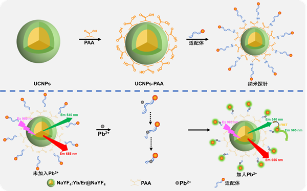 图1. 双信号反向变化上转换纳米探针设计及对Pb²⁺检测传感机制的示意图。