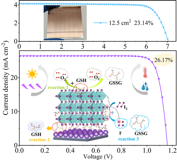针对这一行业共性难题,研究团队将GSH作为多功能添加剂,构建“偶极子调控+氧化还原自修复”协同体系,实现从薄膜微结构到器件界面的跨尺度优化:通过界面偶极子工程与缺陷钝化,提升载流子分离与传输效率,降低非辐射复合损失;优化钙钛矿结晶动力学,制备出致密均匀、低缺陷的高质量薄膜,增强结构稳定性;构筑化学防护与氧化还原自修复机制,有效抵御外界环境侵蚀,显著提升器件长期稳定性。基于此,研究团队制备的小面积电池光电转换效率达到26.17%,微型组件(12.50 cm2)效率达23.14%,处于国际同面积组件先进水平。同时,器件在高温、高湿、光照及紫外等ISOS(国际有机光伏稳定性峰会)协议测试条件下,均表现出优异的稳定性,大幅优于传统器件,有效解决了效率-稳定性权衡难题。该研究提出的“动态调控+静态防护”理念,为高效稳定钙钛矿太阳能电池的开发提供了全新思路,对推动其规模化应用具有重要意义。