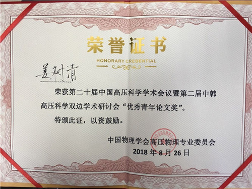 本次会议中,姜树清博士做了题为“高温高压下合成金属氮”的报告并获得了“青年优秀论文奖”奖项。该奖项由高压物理学会每两年评出5名获奖者。