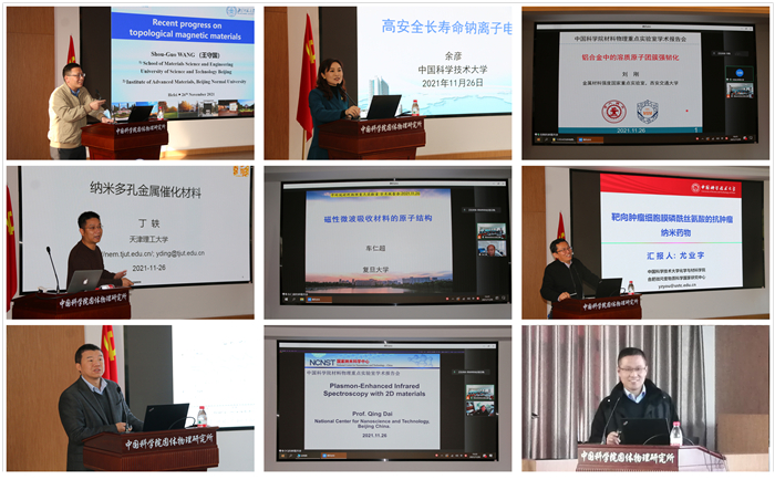 在报告会上,来自北京科技大学的王守国教授、西安交通大学的刘刚教授、天津理工大学的丁轶教授、复旦大学的车仁超教授、国家纳米中心的戴庆研究员、苏州大学的李亮教授,以及中国科学技术大学的余彦、尤业字、杨上峰三位教授,分别通过线上和线下形式做了精彩的学术报告,向大家介绍了其课题组在拓扑磁性材料、铝合金强韧化、纳米多孔金属催化材料、磁性吸波材料、增强红外光谱、钙钛矿太阳能电池、钠离子电池、抗肿瘤药物,以及富勒烯基光电材料等方面的最新进展和科研成果,并和与会师生进行了现场交流探讨。
