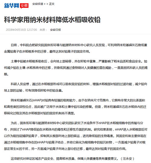 日前,中科院合肥研究院固体所环境与能源纳米材料中心研究人员发现,可利用纳米羟基磷灰石降低重金属铅离子在水稻根系中的迁移,最终达到对铅离子的固定作用。