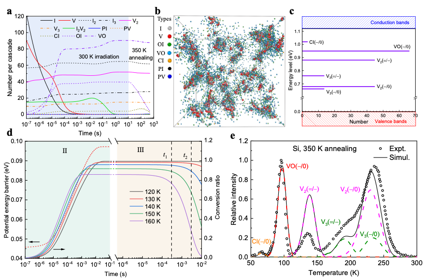 近日,中国科学院合肥物质科学研究院固体物理研究所李永钢研究员、曾雉研究员团队与北京计算科学研究中心黄兵研究员合作,发展了第一性原理驱动的多尺度模型框架,用于辐照半导体中深能级缺陷的多维度鉴定,解决了非平衡半导体缺陷原子起源及动力学演化的难题。相关成果以“Multidimensional defect identification of semiconductors in nonequilibrium”为题,发表在国际知名期刊Nature Communications上。