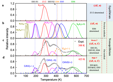 随着深空探测、核能应用和量子科技等需求的增长,确定半导体缺陷的原子起源对于缺陷调控及光电子器件优化至关重要。然而,半导体器件在工艺加工和高能粒子辐照环境下,会产生大量非平衡态缺陷。此类缺陷相对于平衡态缺陷的识别极具挑战性,现有的表征技术如深能级瞬态谱(DLTS)只能探测光电信号,无法解析缺陷的原子起源,而传统的平衡态缺陷理论也难以处理非平衡缺陷的多维特性。