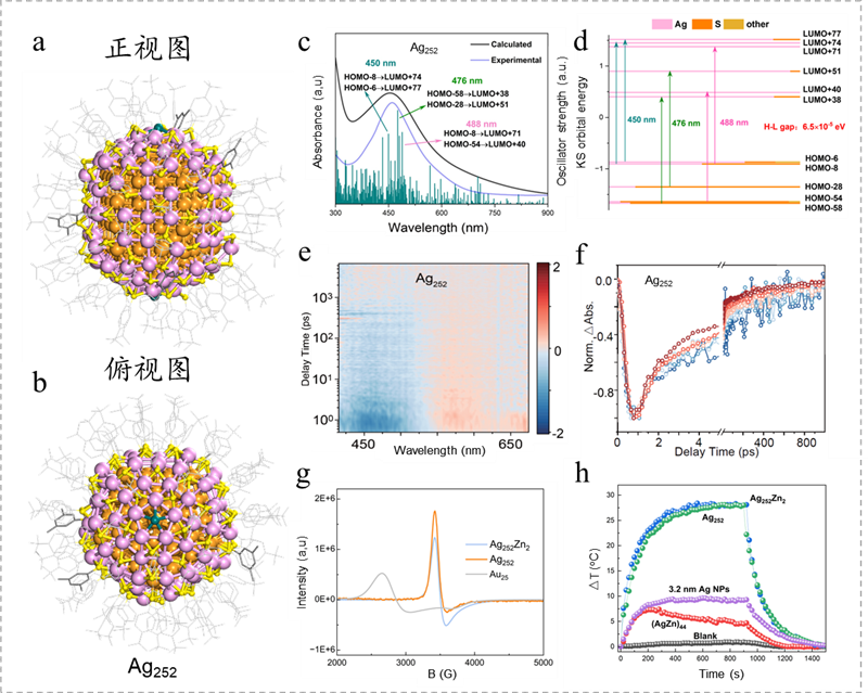 图2. Ag252的五重孪晶面心立方(a)正视图、(b)俯视图、(c)理论和实验吸收光谱、(d)分子轨道能级、(e)超快吸收光谱、(f)超快动力学曲线、(g)电子顺磁共振光谱和(h)光热转换曲线。在(g)和(h)中,还有其它材料作为对比。